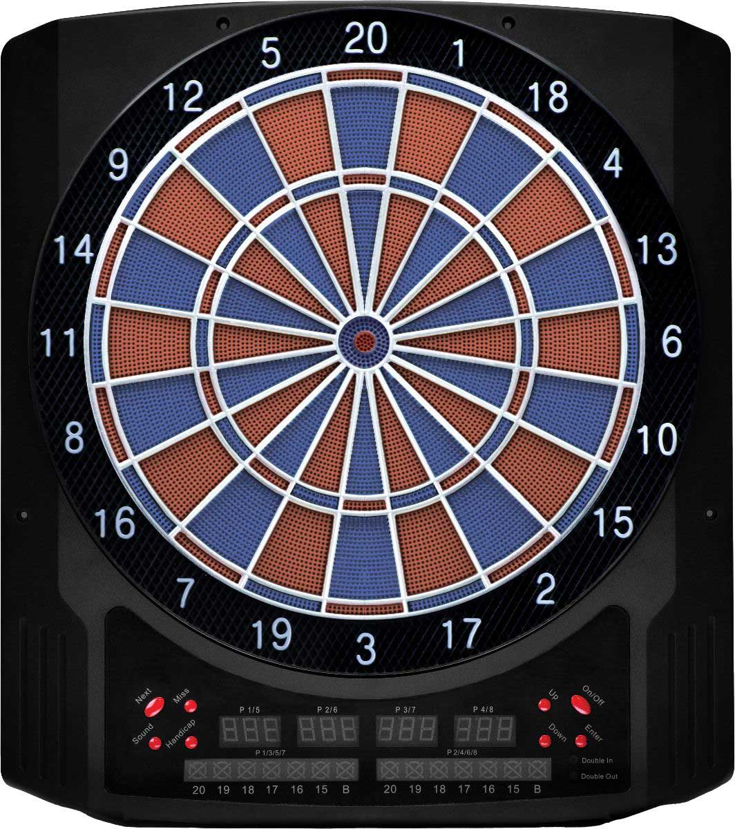 Max. für 8 Spieler, LED Anzeige für 4 Spieler, bei Cricket für 2 Spieler. 2-Loch Double/Trible Segmente, 36 Spiele mit mehr als 580 Varianten.Es werden 6 x 12 Gramm Darts und 30 Softdartspitzen mitgeliefert.