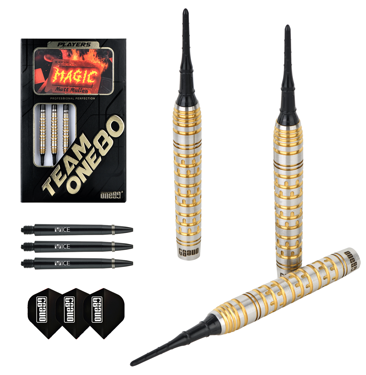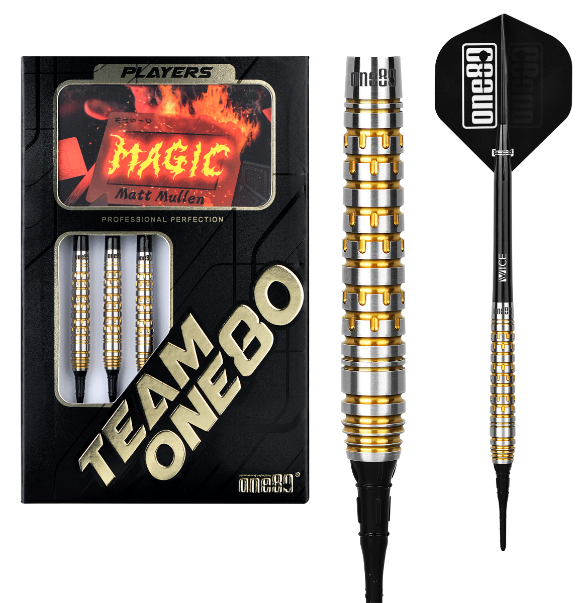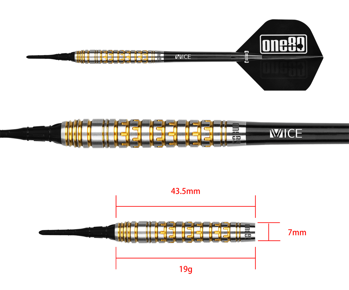 Dieser wunderschöne 90% VHD Tungsten Softdart von "The Magic" hat 3 Griffzonen, wobei die innenliegenen Rillen golden Eloxiert sind. Die Torpedoform macht den Dart leicht Frontlastig.Diesen Dart gibt es nur in 19 Gramm.