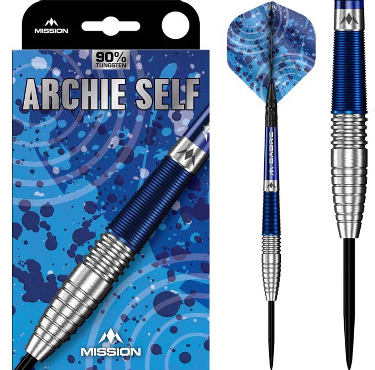 Dieser 90% Tungsten Dart vom englischen Nachwuchstalent hat 3 verschiedene Ring-Grip Flächen. Er ist leicht frontlastig und hat eine silber/blaue Optik. siehe Artikelbild.