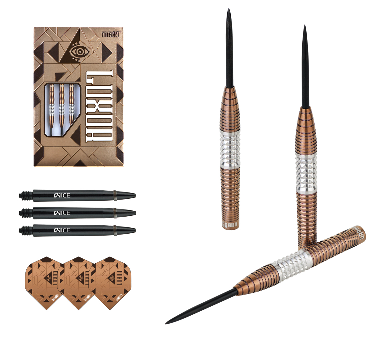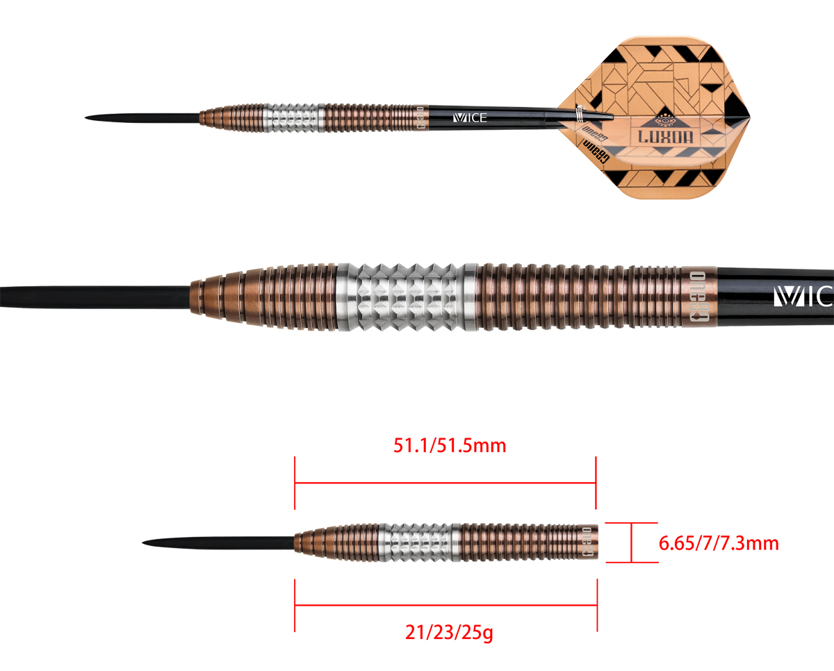 Dieser 90% VHD Tungsten Dart hat eine leichte Torpedoform und 5 Griffzonen. Hauptzone ist hinten die Ring-Grip-Zone und vorn die Micro-Ring-Grip Zone, die durch den typische Luxor-Grip getrennt werden. siehe Artikelbild.