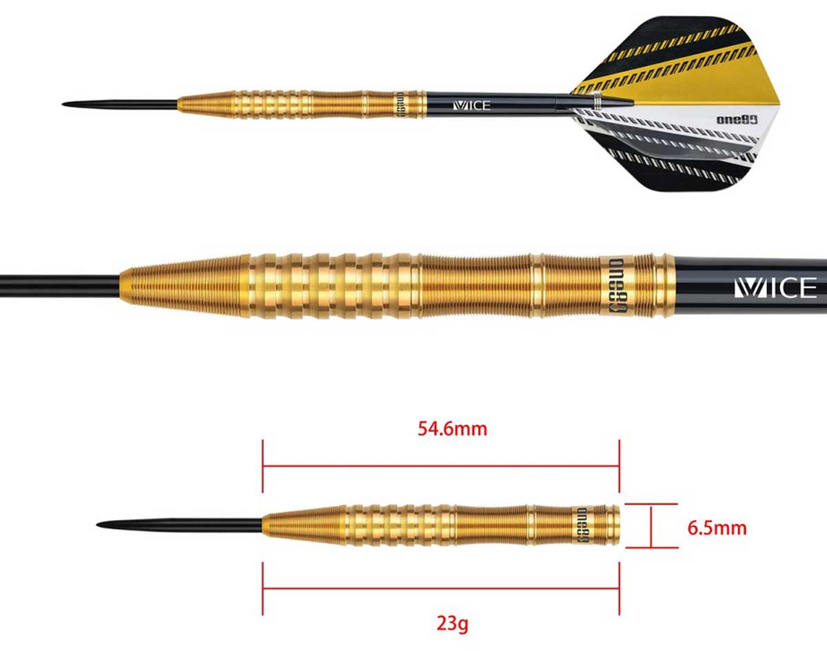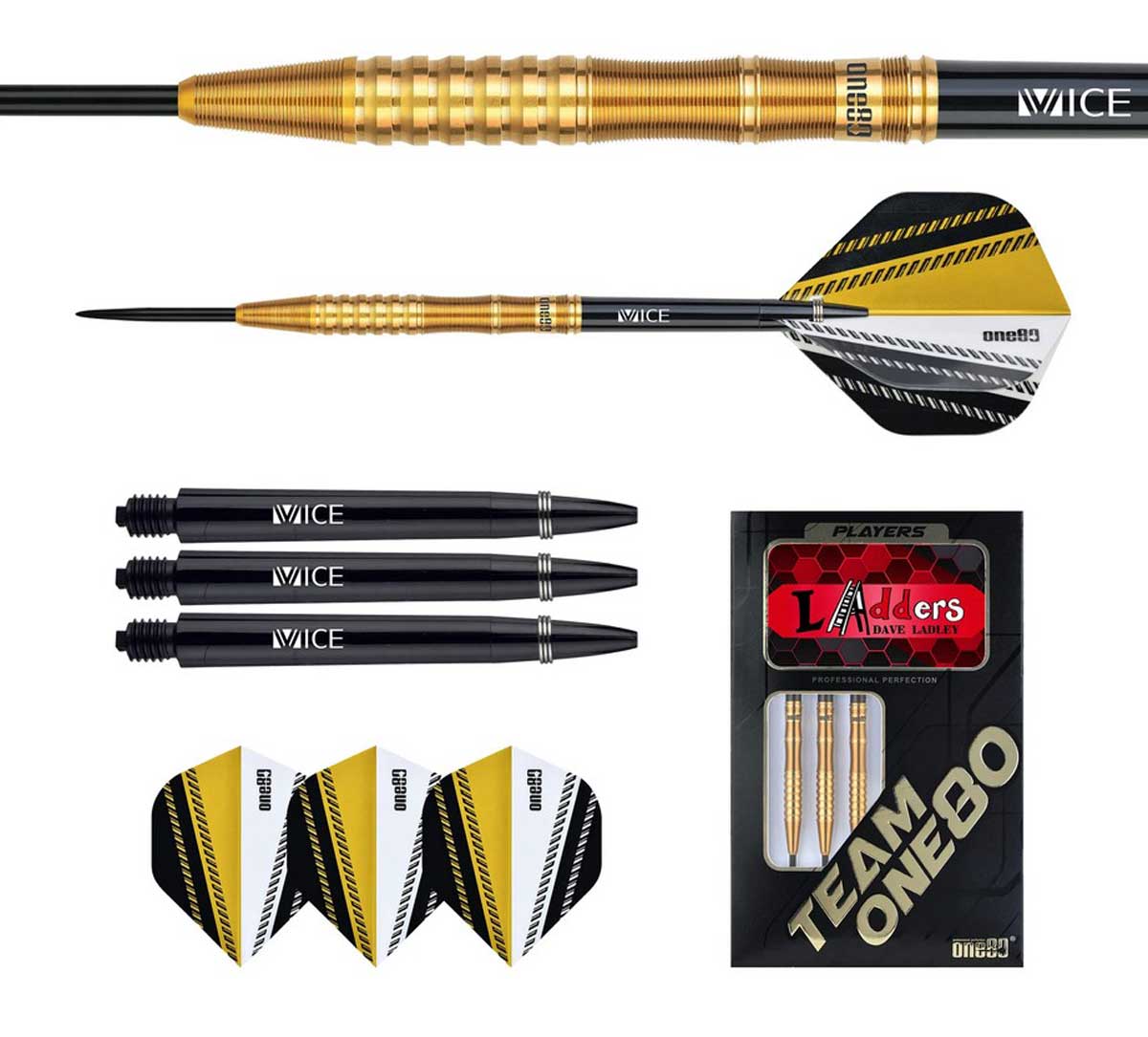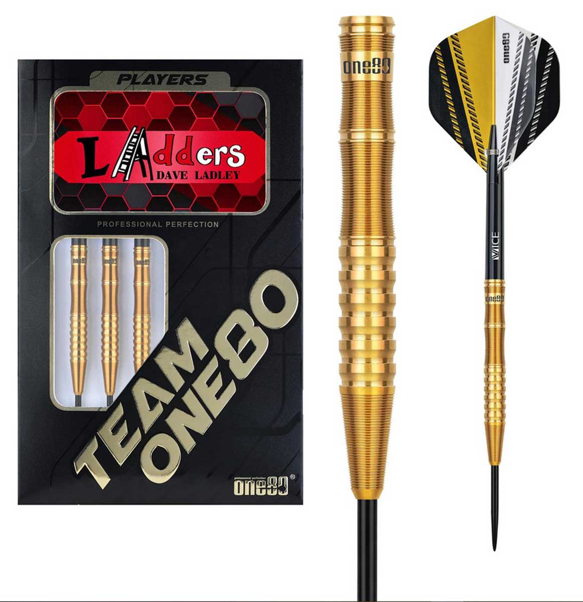 Der 90% Tungsten Dart von Dave "Ladders" Ladley hat Micro- und breite Rillen, die in 4 Gripzonen aufgeteilt sind. Die goldene Beschichtung macht den Dart zum Hingucker.Diesen Dart gibt es nur in 23 Gramm.