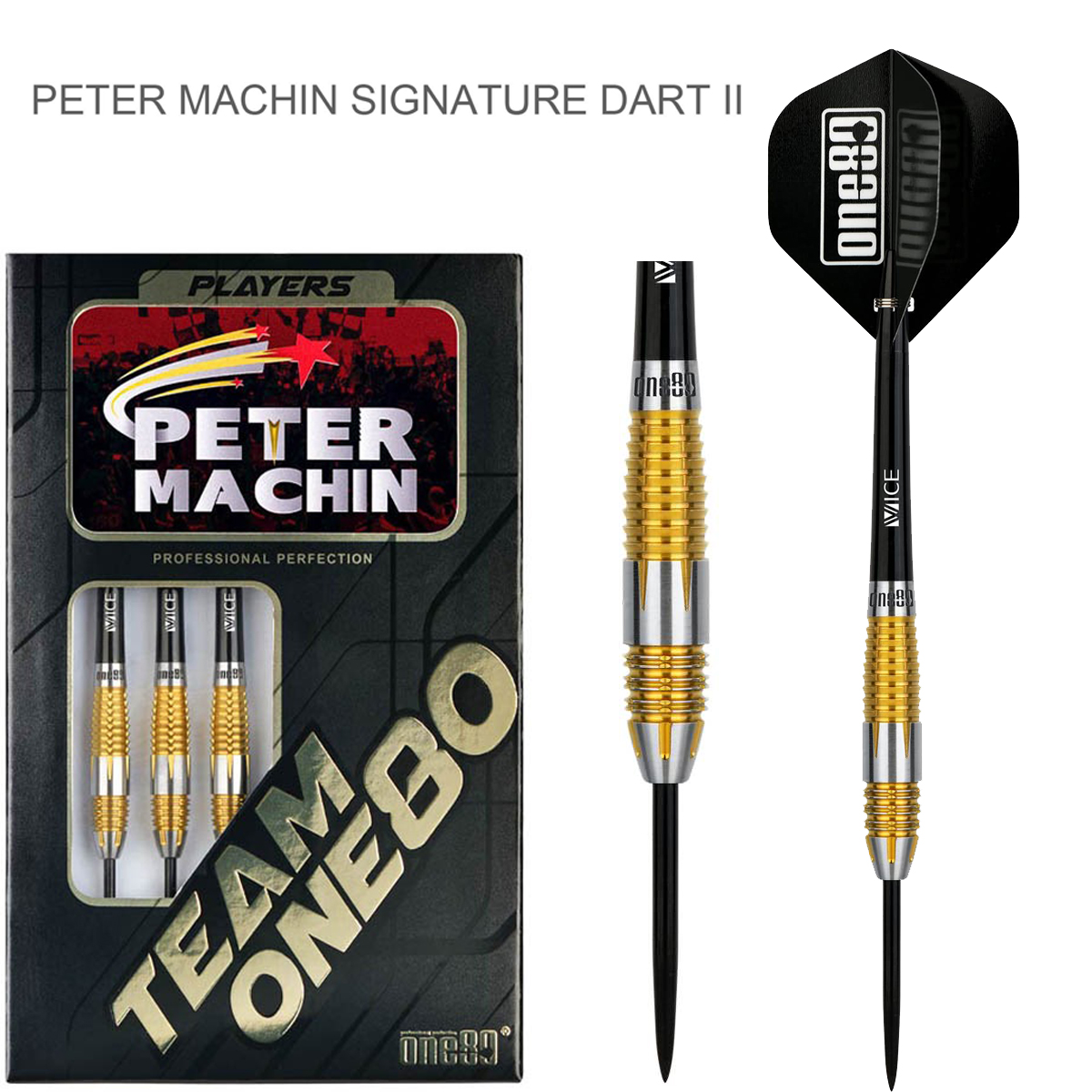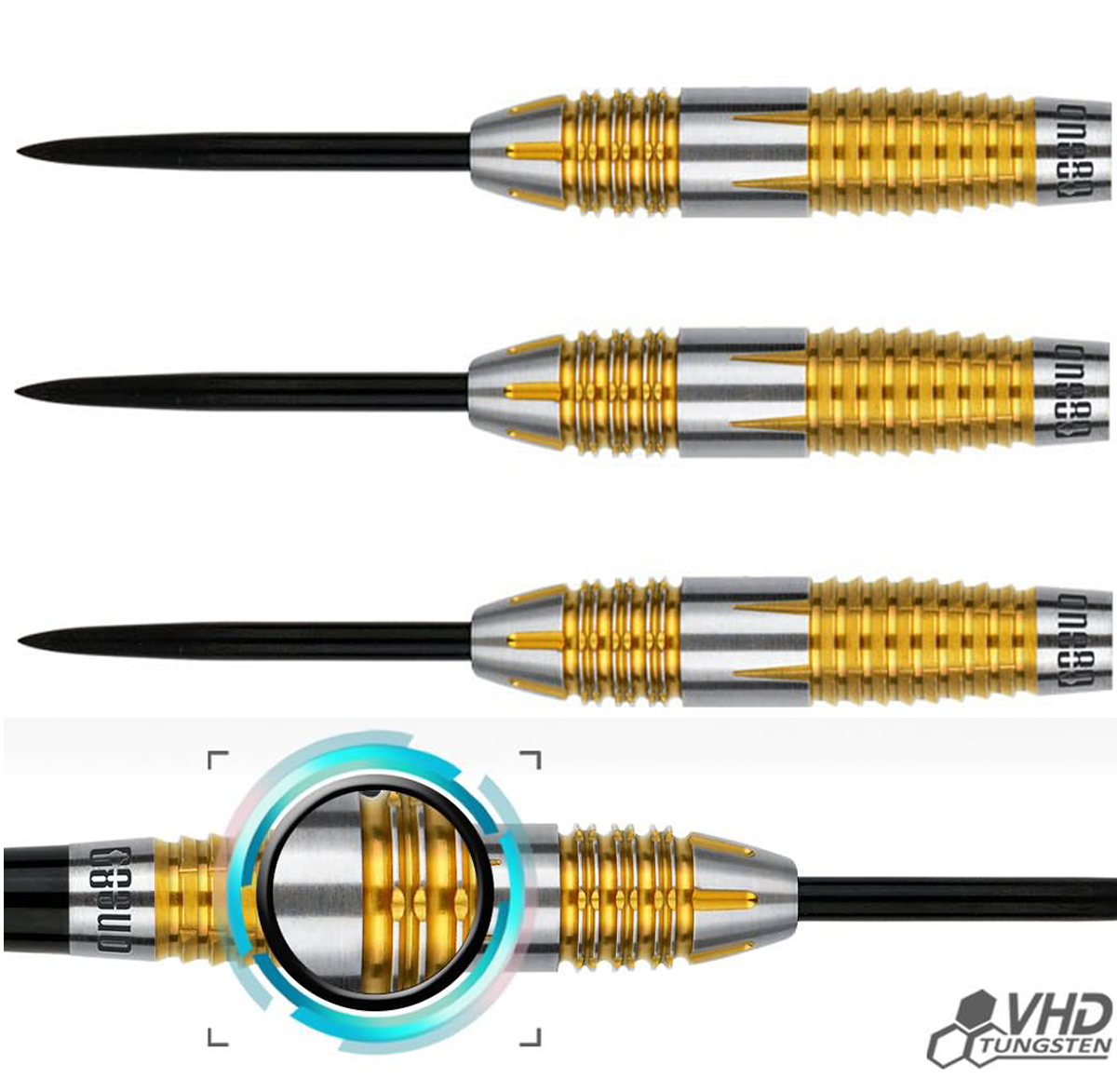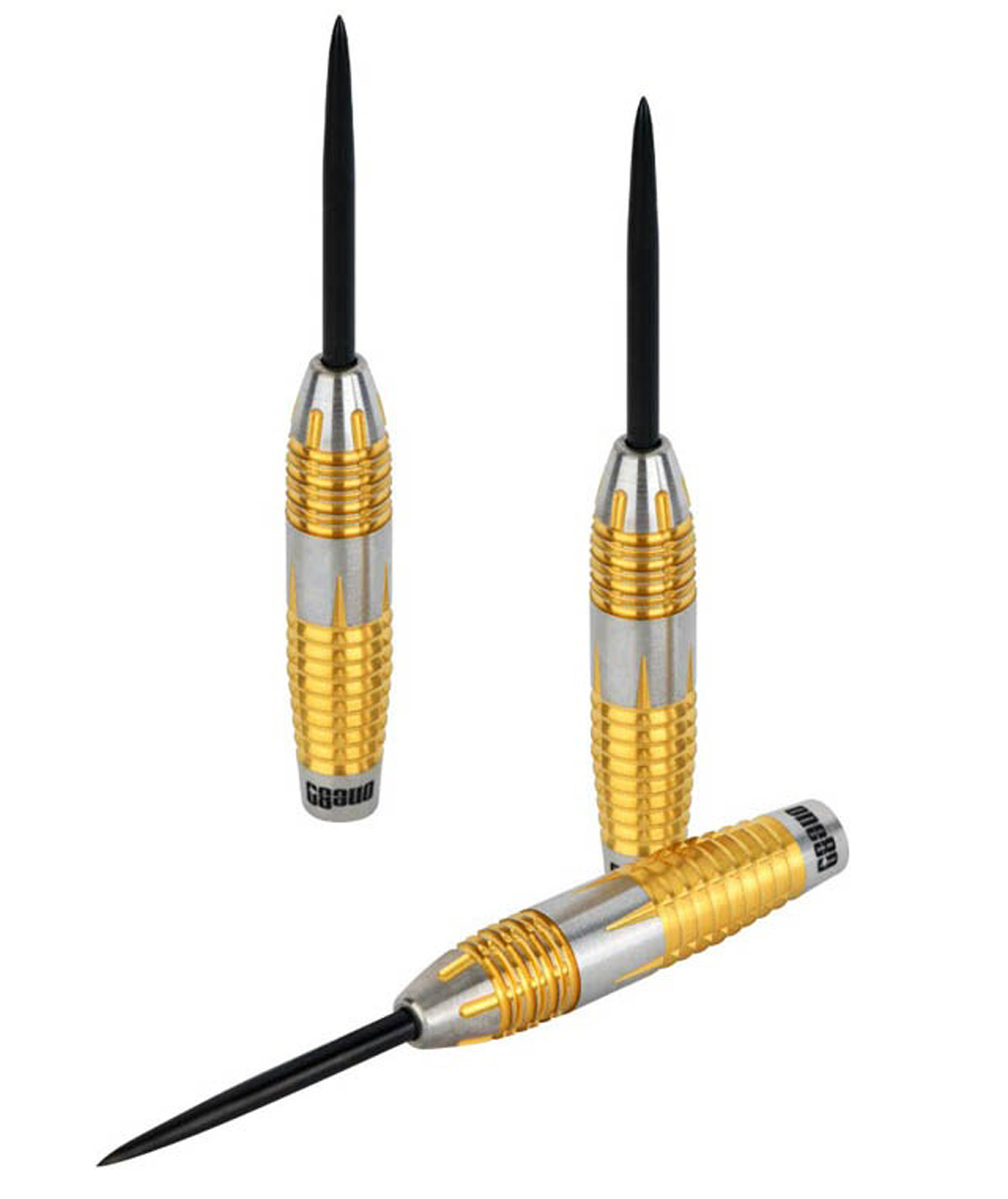 Die 2te Generation des 90% VHD Tungsten Darts von Peter Machin. Die goldenen Grip-Zonen haben vorne einen Ring- und hinten einen Shark-Grip.Nur in 23 Gramm.
