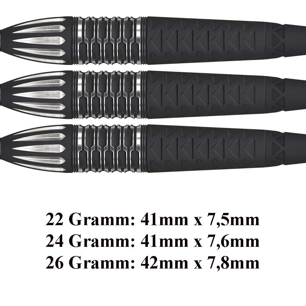 Die 11te Generation 9Five von "The Power" aus 95% Tungsten hat wieder 3 Griffzonen. Im vorderen Breich eine silber unterlegte Längsrille, im mittleren Bereich eine Wabenstruktur und im hinteren Bereich ein Dreieckdesign. Typisch für diesen Dart, ist die schwarze PCD Beschichtung.Das Target SWISS Point System ermöglicht dem Darter die Spitzen, mittels einem mitgeliefertem Tool, selber zu wechseln.