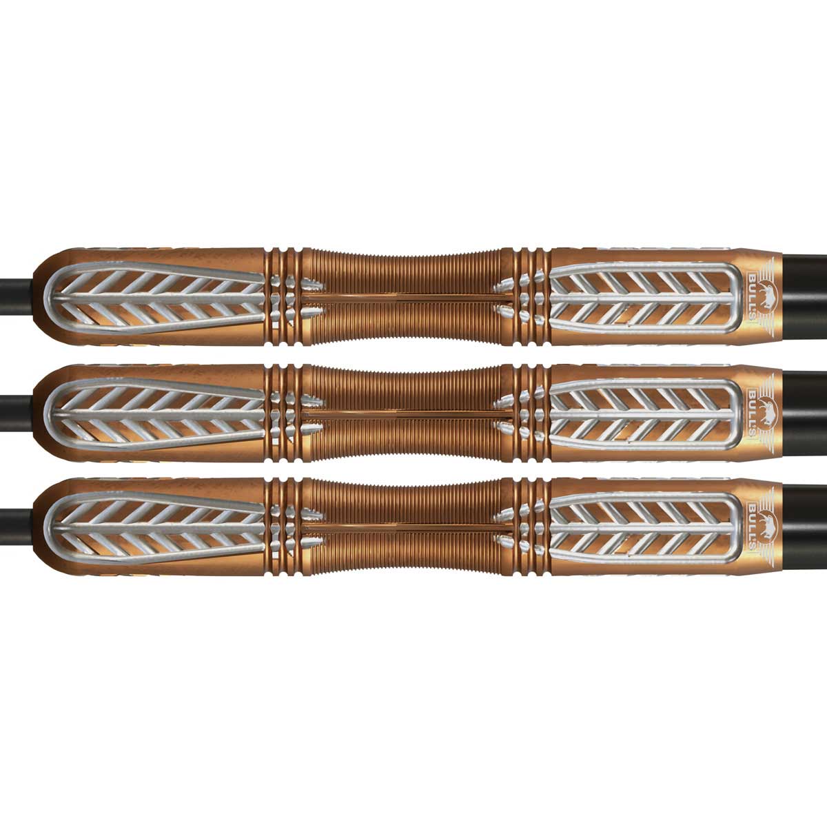 Dieser bronzefarbener Dart hat einen 90% Tungstenanteil und eine Griffmulde im mittleren Breich, die mit Microrillen ausgestattet ist. siehe Artikelbild.