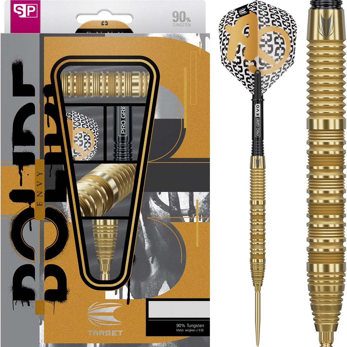 Der "Bolide Envy" von Target hat einen Tungstenanteil von 90%. Die Vertiefungen der golden eloxierten Darts sind Sandgestrahlt, womit sich eine tolle Optik ergibt.Das neue Swiss-Point-System ermöglicht dem Darter die Spitzen, mittels eines einfachen, mitgeliefertem Tool, selber zu wechseln. Damit kann man Struktur und Farbe der Spitzen selber bestimmen.