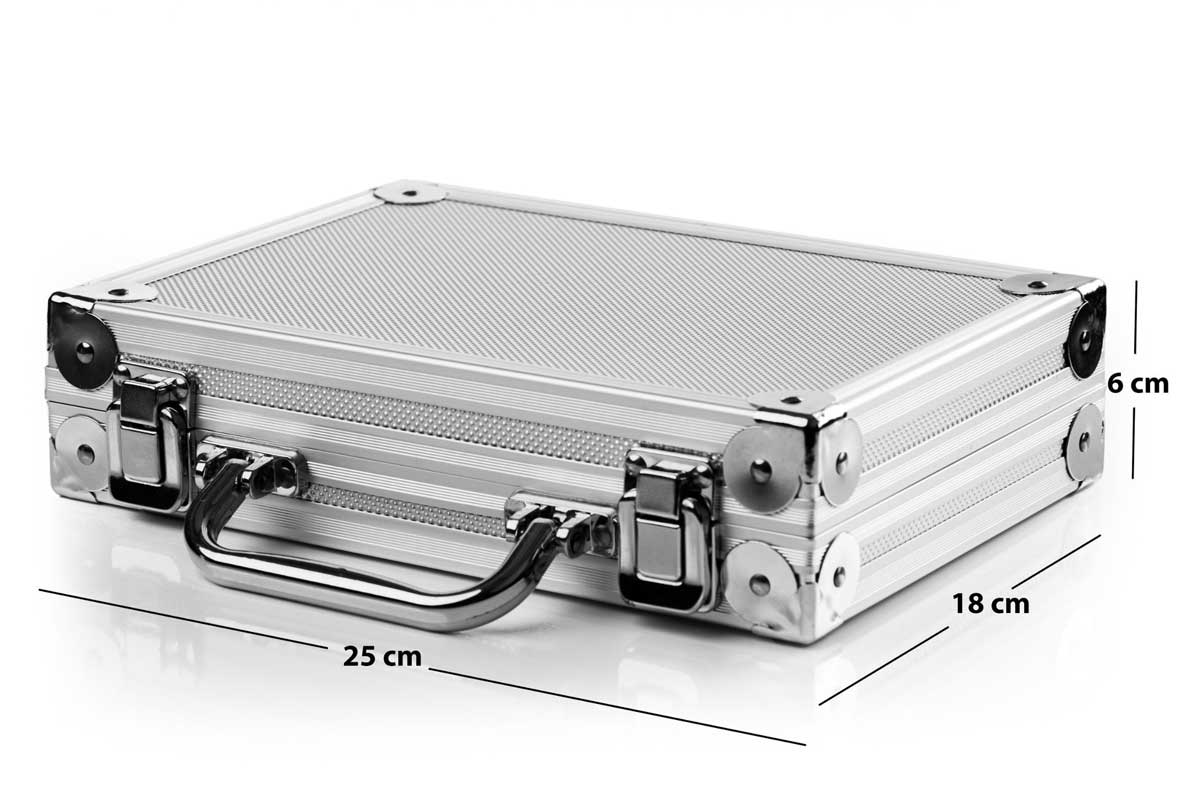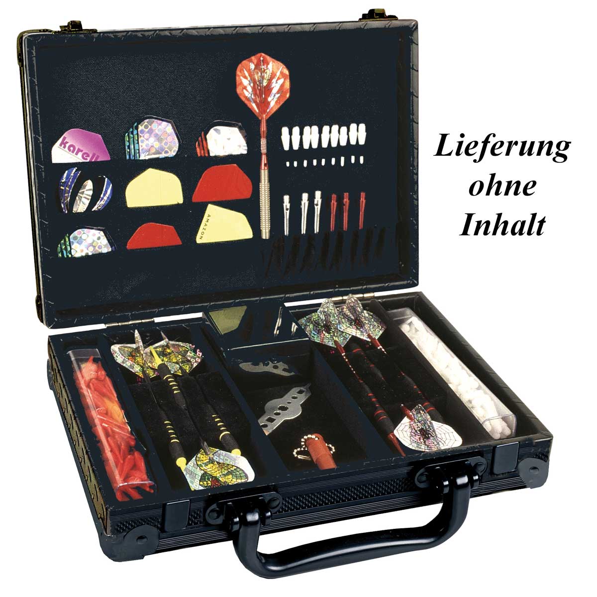 Das Karella Aluminium Case bietet den perfekten Schutz für deine hochwertigen Darts und hat genügend Platz für 2 Dartsets und dein Dartzubehör und ist mit hochwertigen, eloxierten Aluminium Profilen gefertigt. Im Inneren schützt Schaumstoff die Darts und viele kleine Fächer bieten Platz für Flights, Schäfte und andere Kleinteile. Für deine Dartspitzen sind zwei Röhrchen im Koffer.